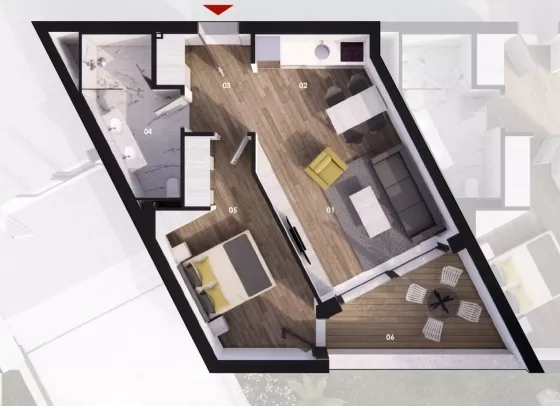 Квартира с одной спальней площадью 53.9 м2.Третий этаж
